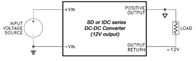 Connecting the output circuit reference node (ground) to the positive output will cause the output common of the device to be at a relative negative voltage. For example, by connecting the 12V output of the 12V output versions of SD or IDC series to ground, the output common may be used to supply a negative voltage (-12V) to the load. (See Fig. 2).